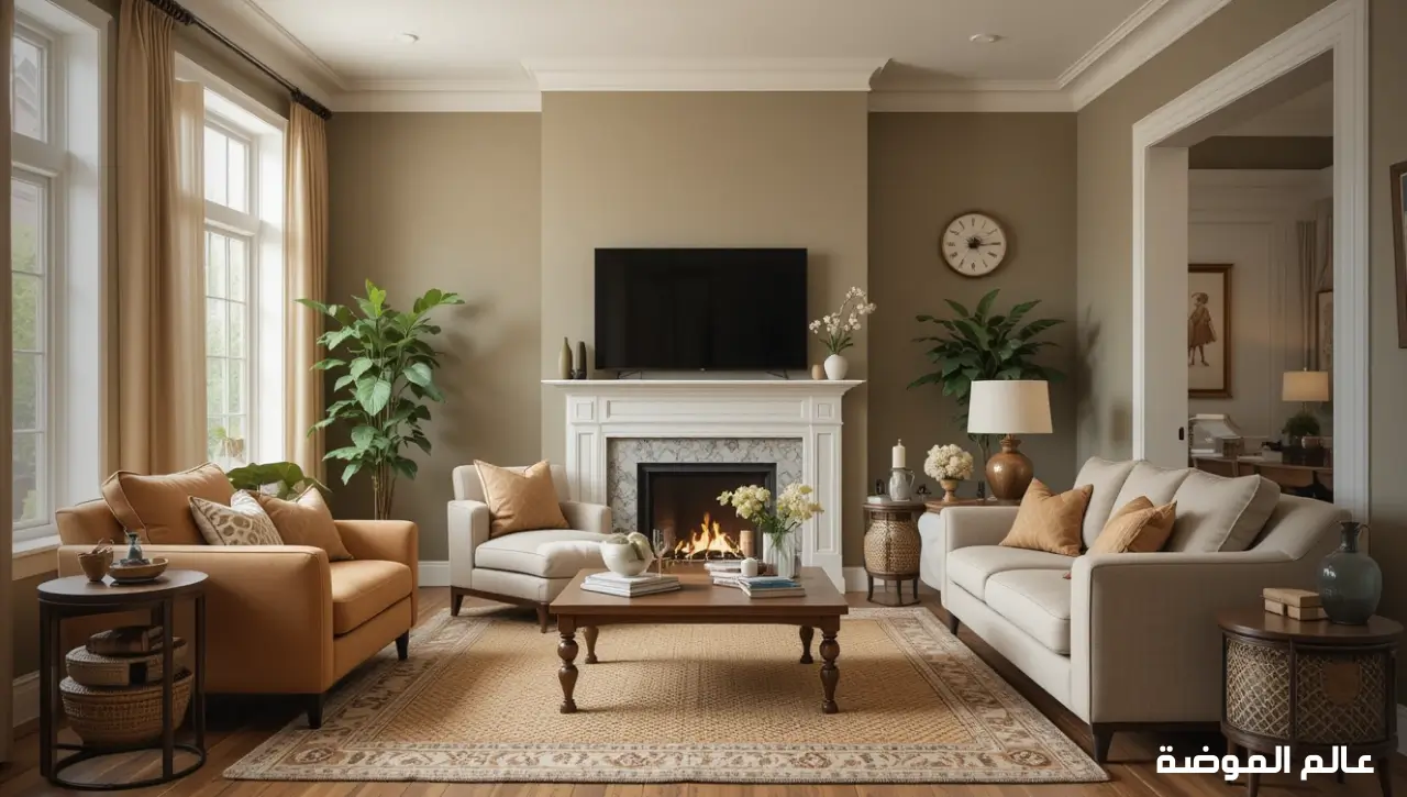 نصيحة ديكور: لتعزيز التناغم، يمكنك استخدام وسائد أو سجاد يجمع بين لون الجدران ولون الأثاث. مما يخلق رابطًا بصريًا أنيقًا يضيف لمسة إبداعية للصالة.